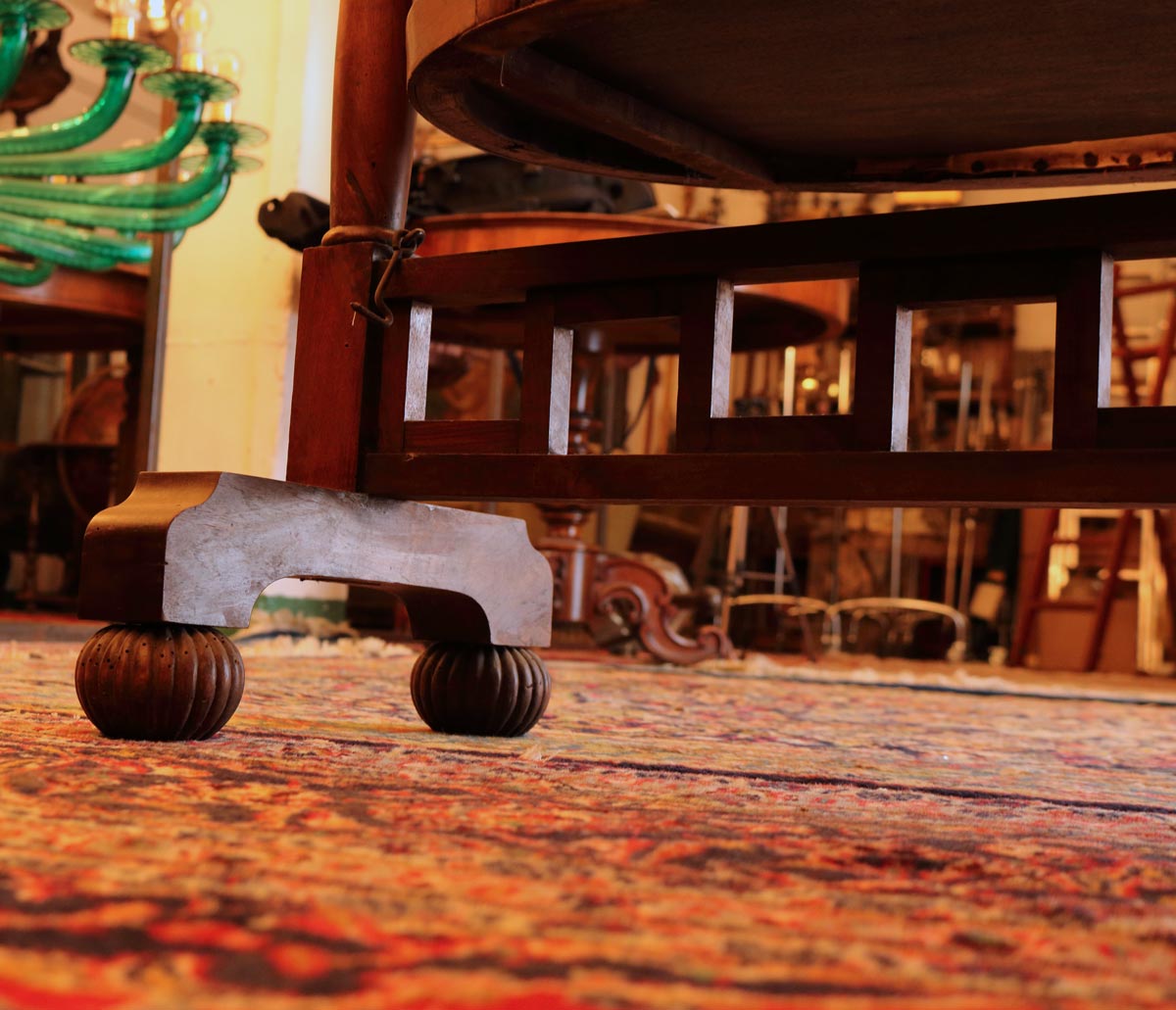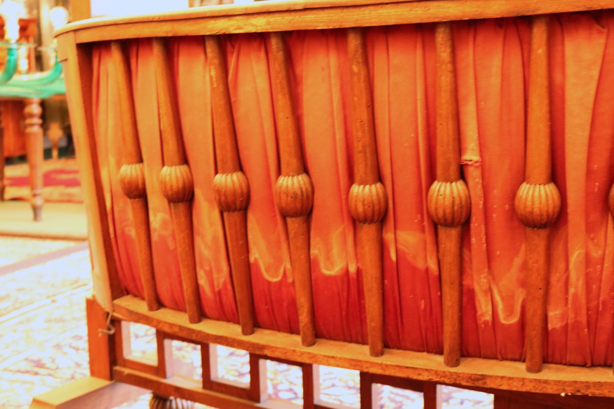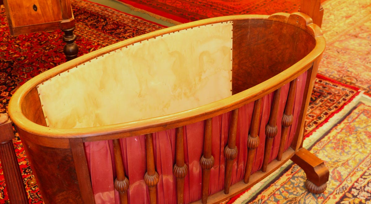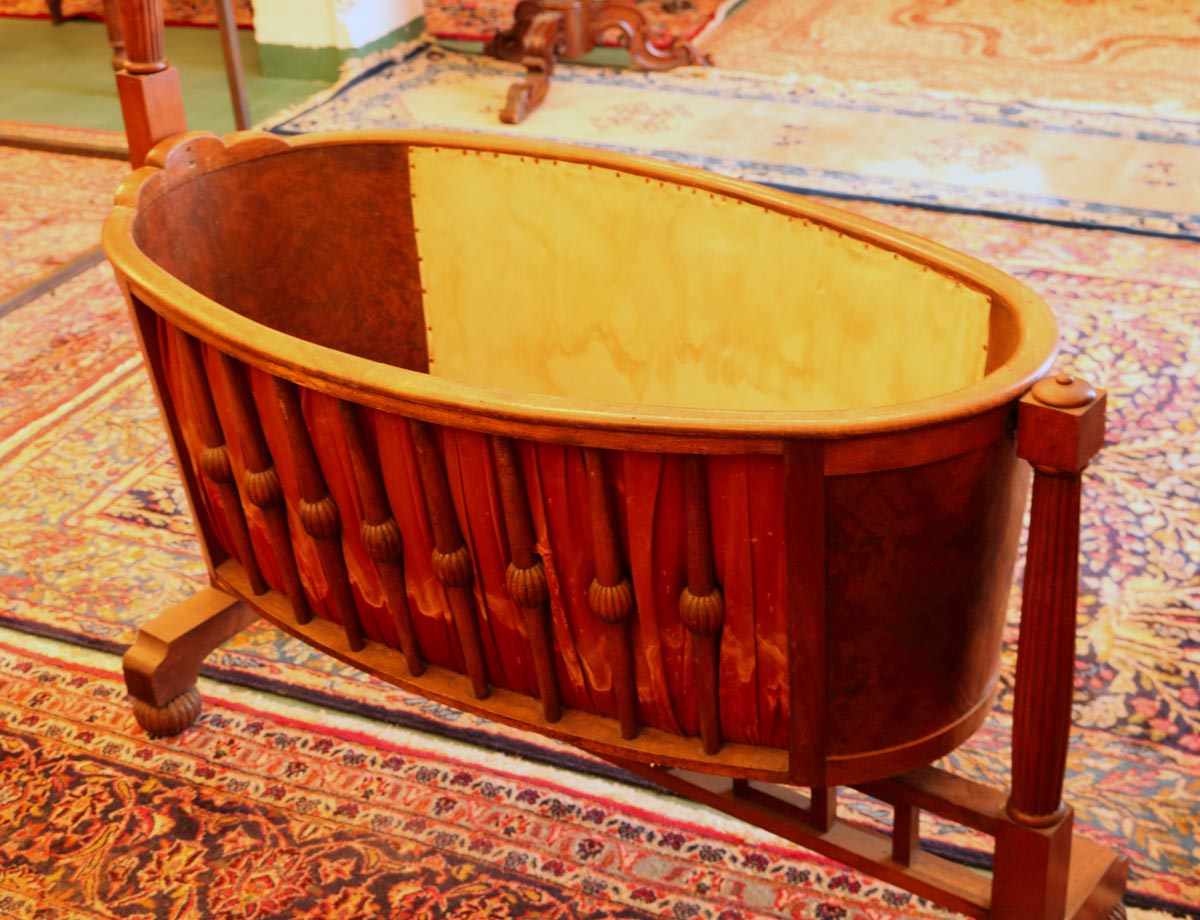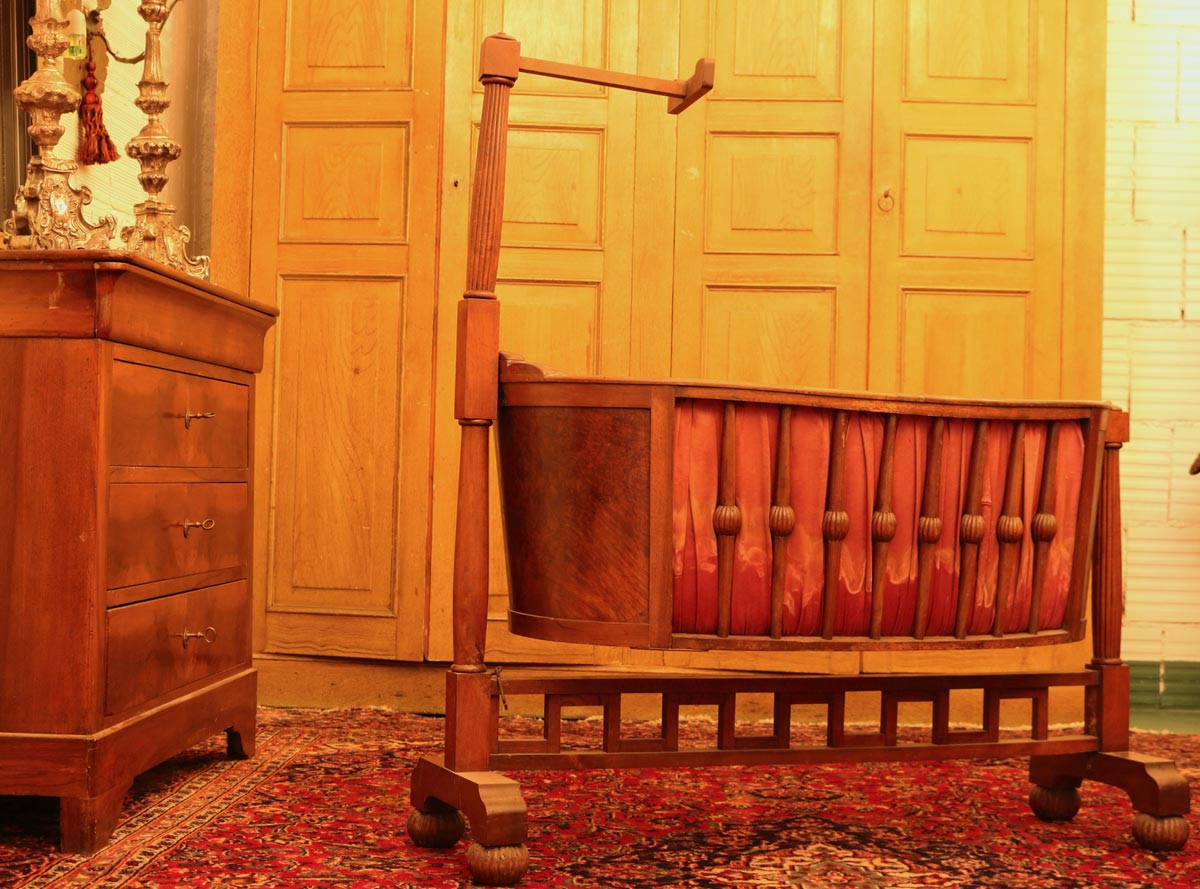 La culla è stata realizzata in legno di noce biondo con lavorazione a massello intagliato con braccio porta tendina.
