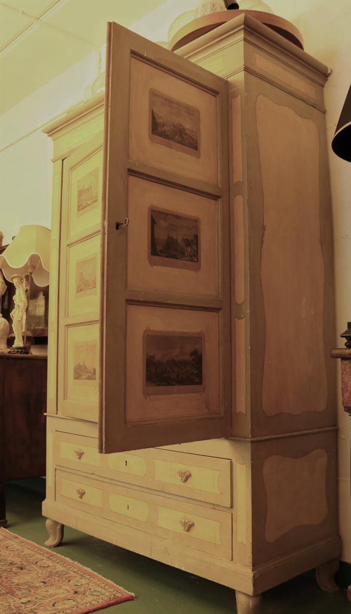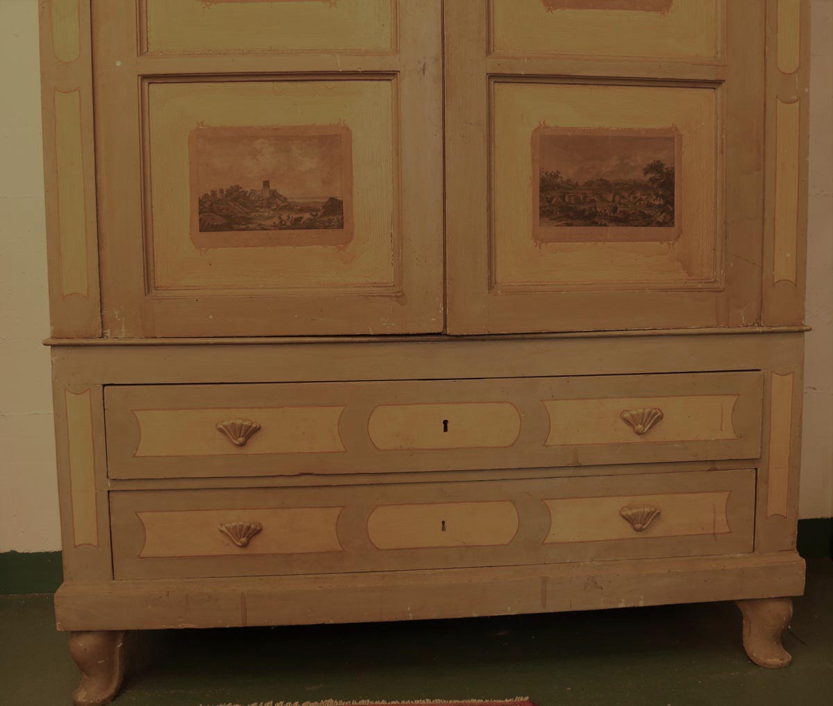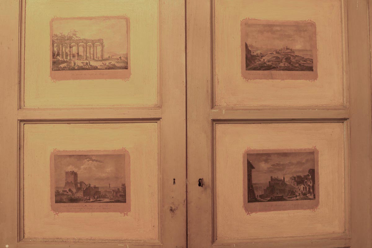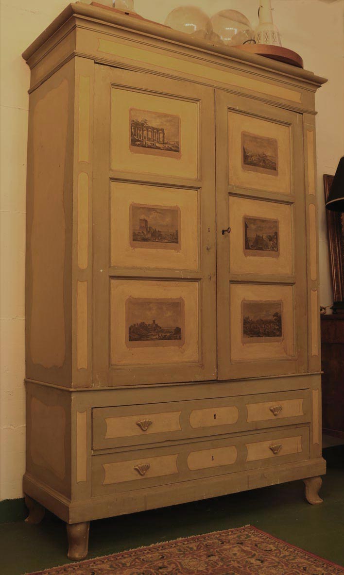 Questo armadio-credenza è composto da due ante e presenta due cassetti nella parte inferiore. Tutto l’armadio è dipinto e negli sportelli sono state applicate delle stampe antiche rappresentanti paesaggi italiani.