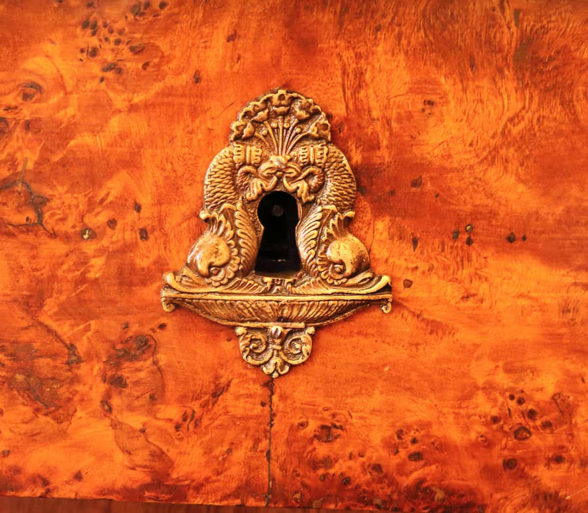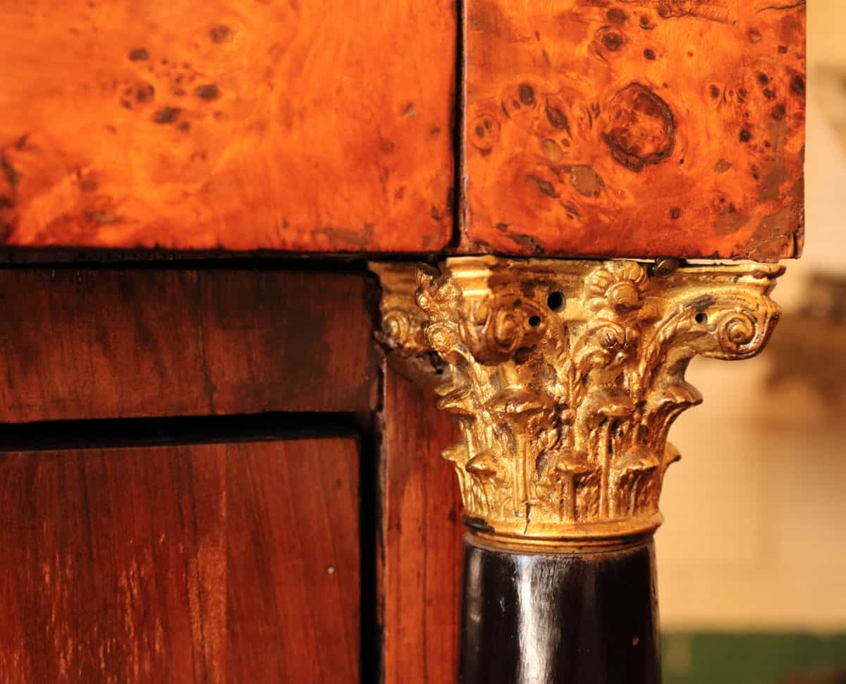 Importante mobile realizzato con legni di frutto e lastronato in radica di ulivo. Il mobile presenta colonne ebanizzate con capitelli in bronzo dorato al mercurio. Le serrature hanno le chiavi originali.