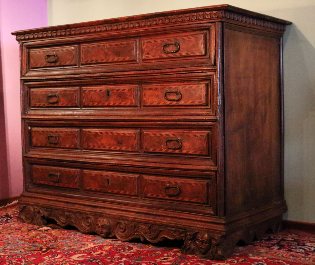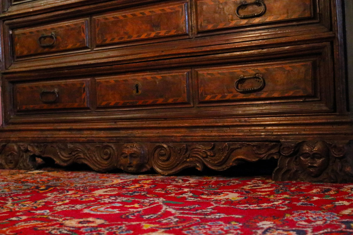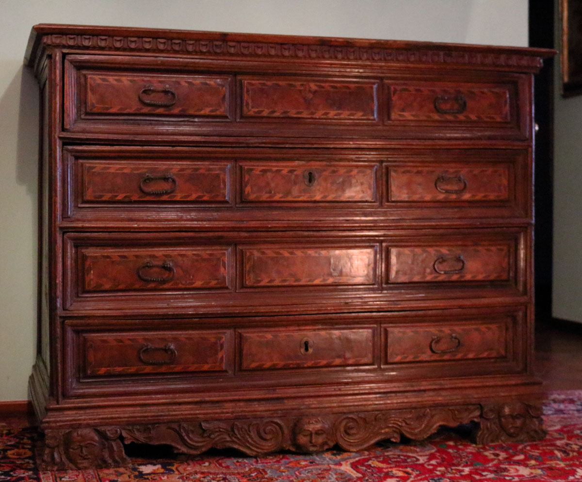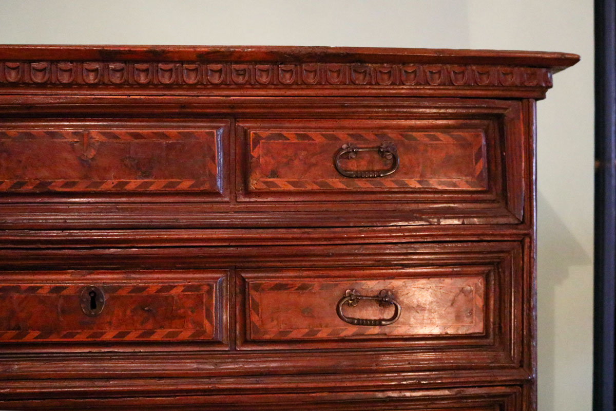 Comò a quattro cassetti realizzato in Umbria nel 1600 con fronte intarsiato e maniglie in bronzo.