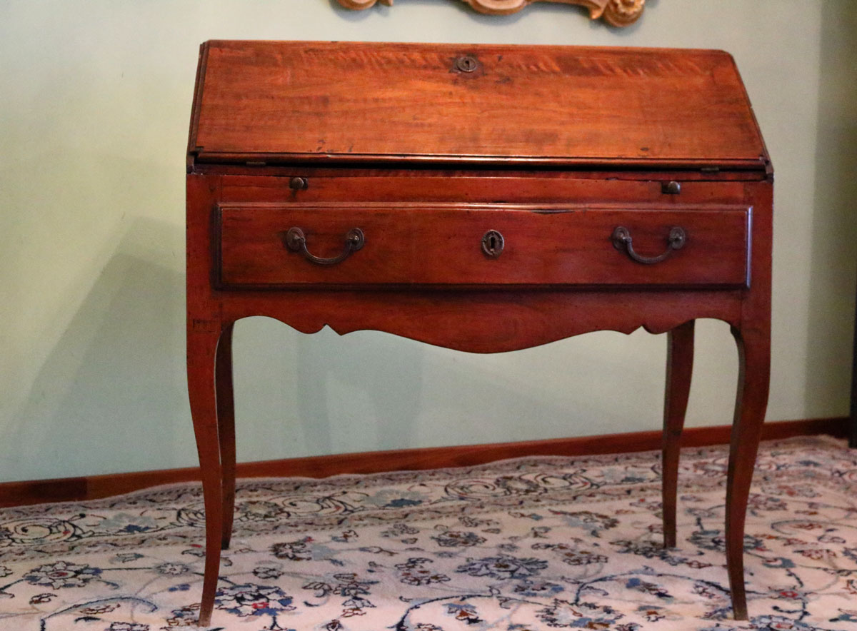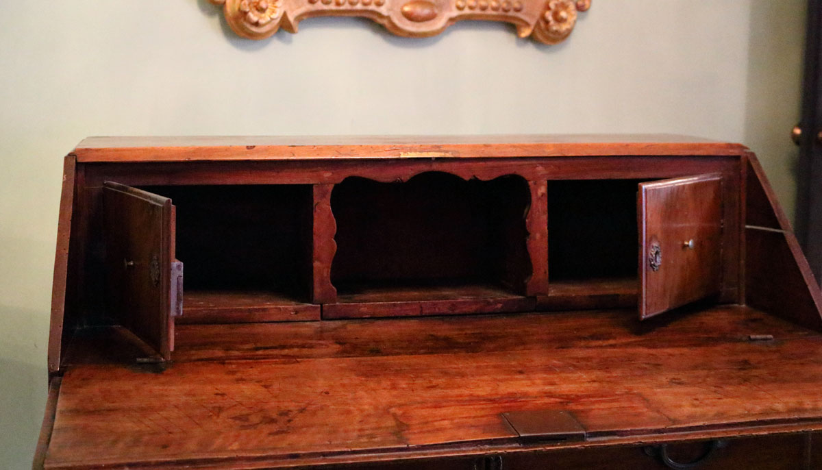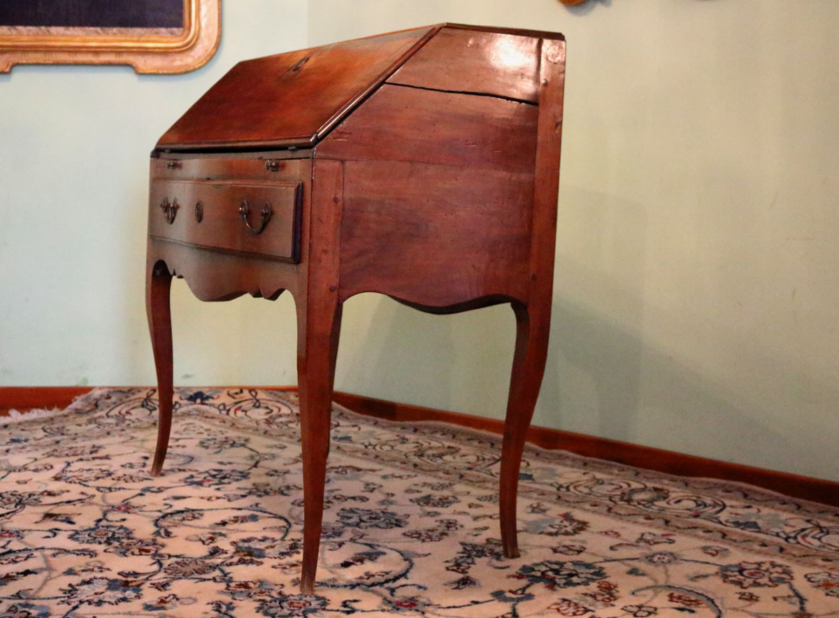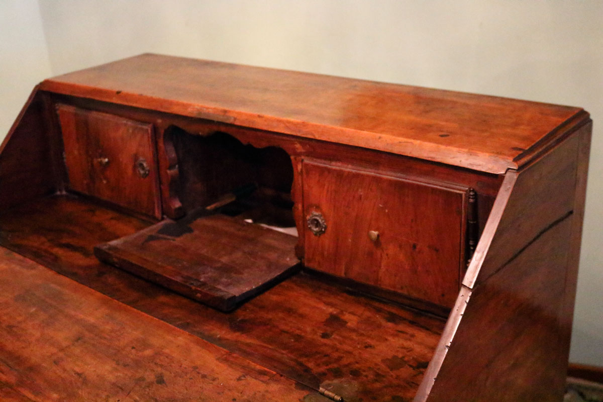 All’interno dello scrittoio si possono trovare tre segreti, due sportellini ed una nicchia. La parte bassa presenta invece un cassetto con maniglie di bronzo.
