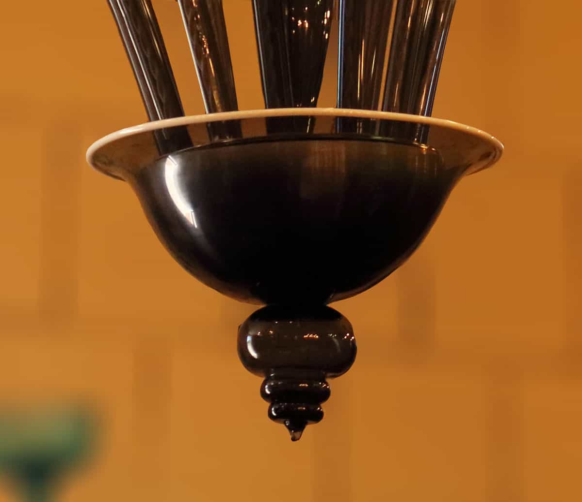 Importante lampadario realizzato in vetro di Murano negli anni 30/35, come si può notare dalla sua caratteristica forma. Il suo colore è rarissimo trattandosi di un canna di fucile (antracite) con bordi in pasta vitrea bianca.