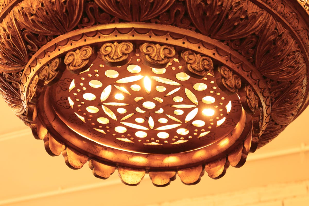 Questo lampadario è realizzato completamente in legno dorato ed intagliato con motivi floreali ed animali.