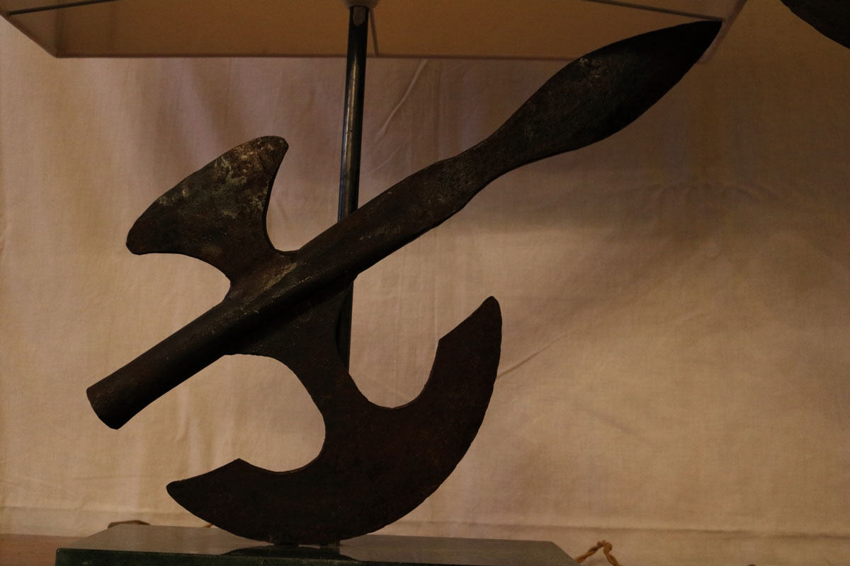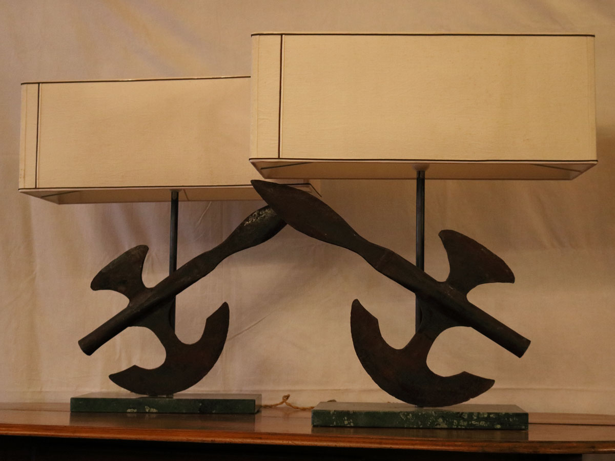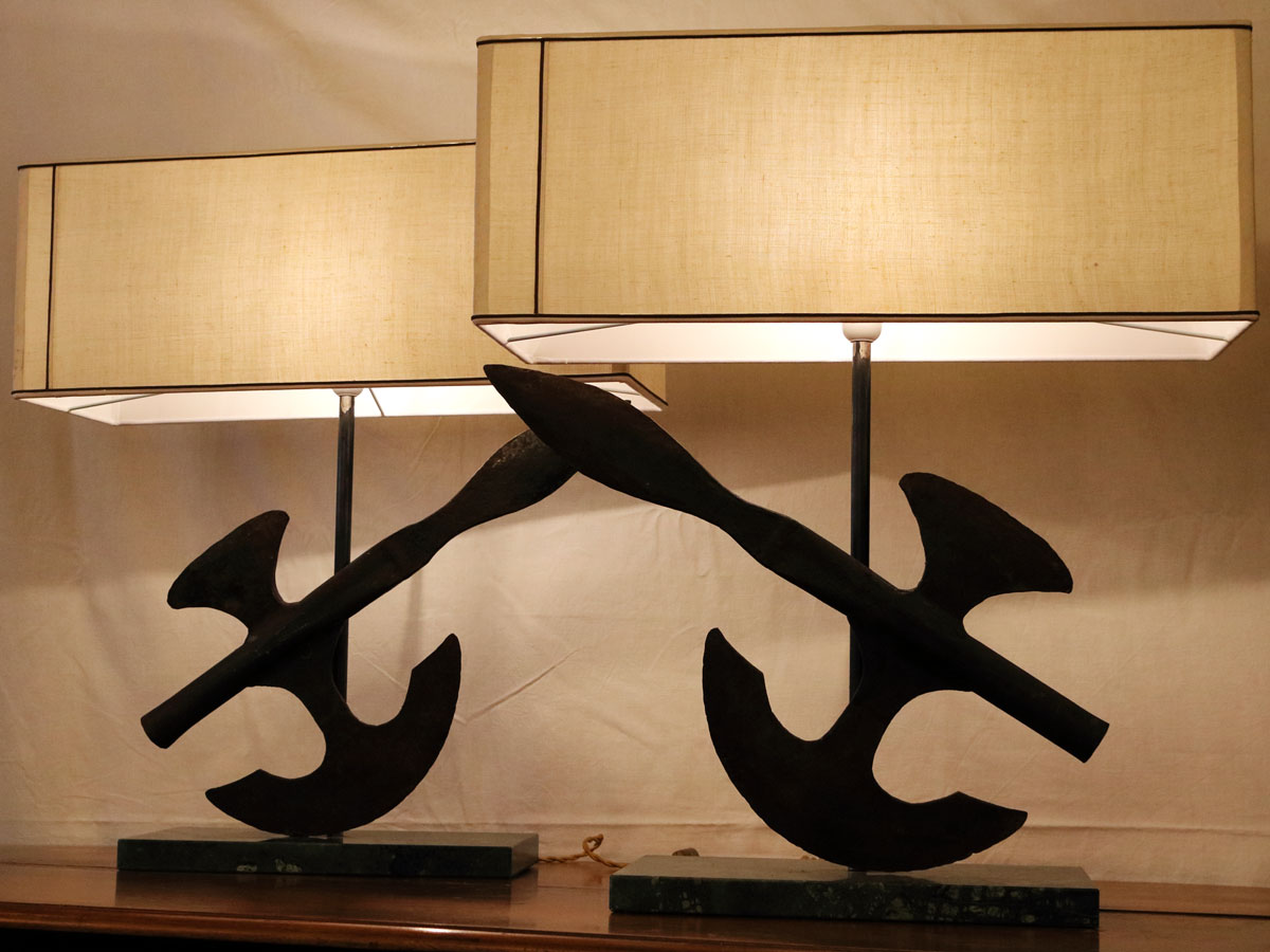 La coppia di Alabarde proviene dalle garitte di difesa di confine della Repubblica di San Marino del XIX secolo. Le Alabarde sono state montate su base in marmo verde Alpi ed i paralumi sono stati realizzati con lino a torsello del XX secolo. Le due lampade prevedono un punto luce all’interno del paralume.