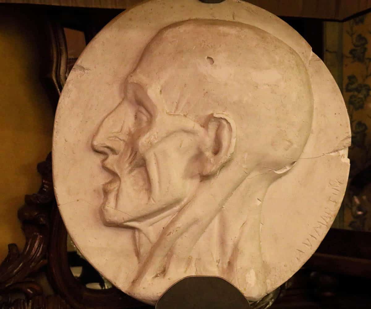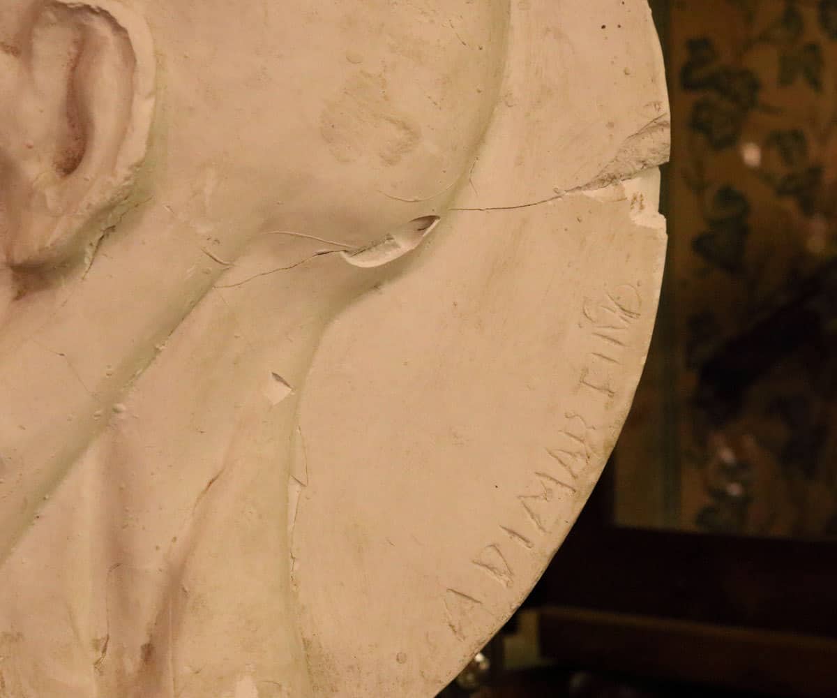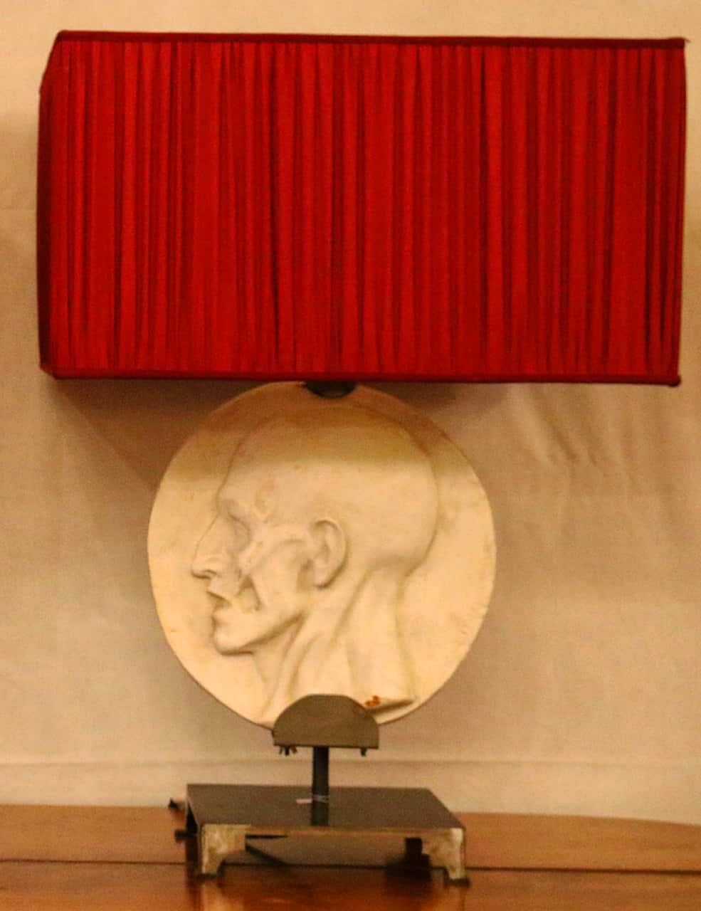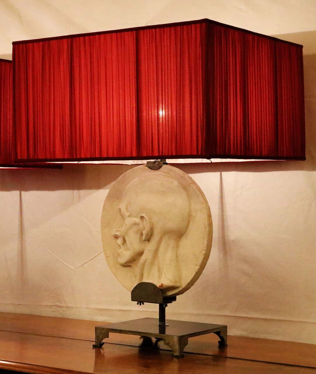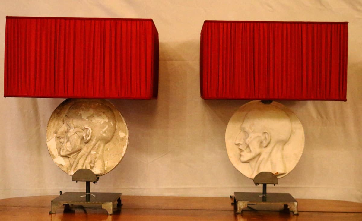 Queste lampade da tavolo sono state realizzate su base di ferro inserendo nella loro struttura delle opere dello scultore napoletano De Martino, famoso per i suoi calchi di gesso basati sui suoi studi anatomici. I gessi portano la firma dello scultore in basso a destra. Il paralume è in seta con lavorazione arricciata di colore rosso all’esterno e bianco all’interno.