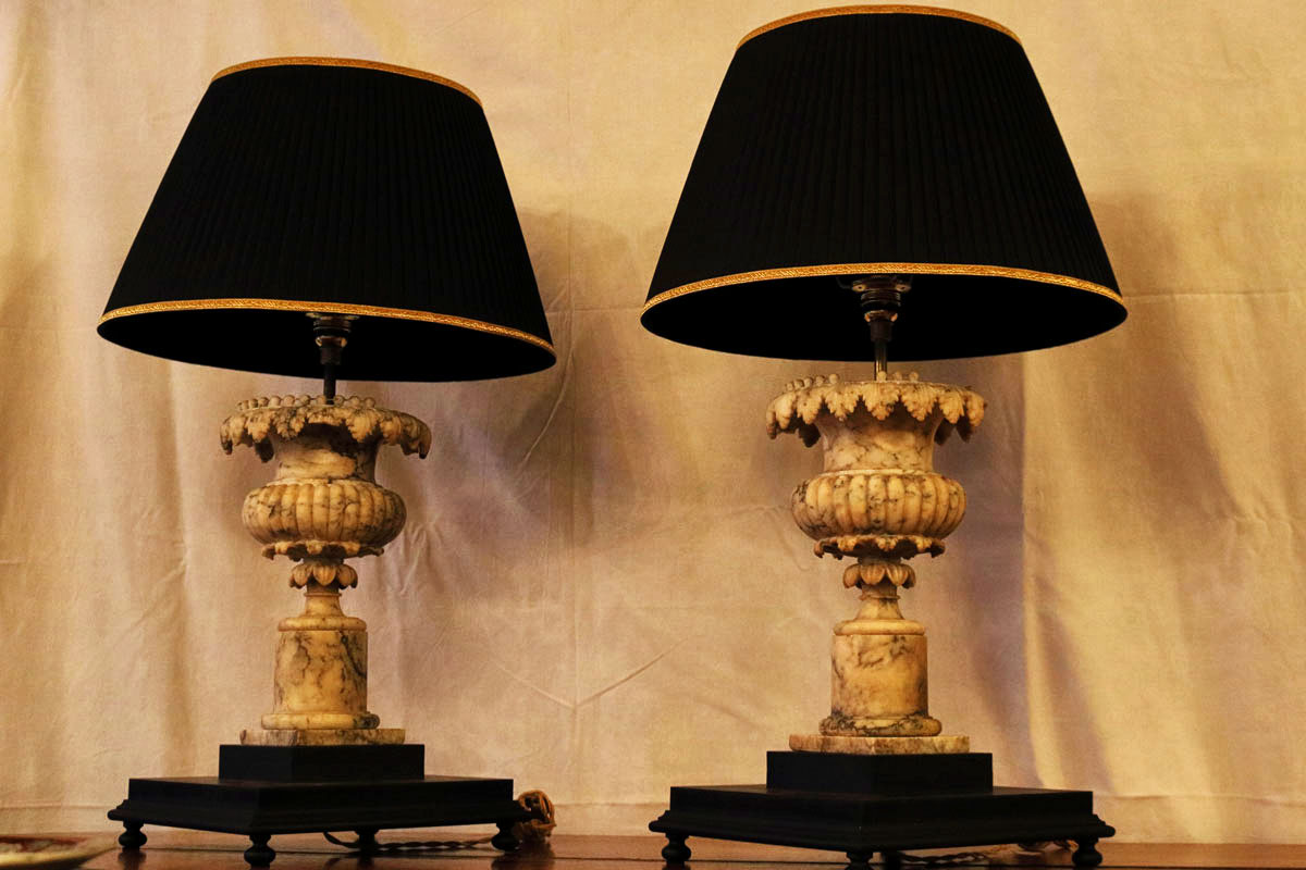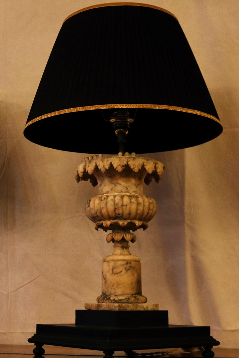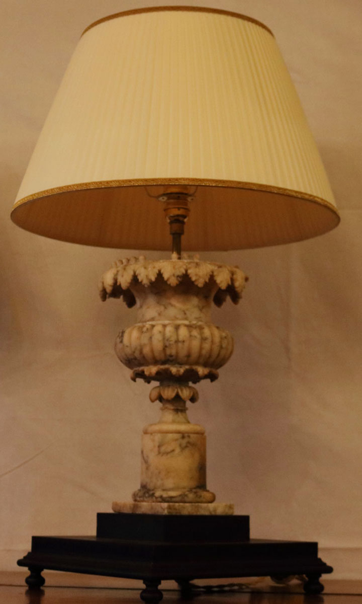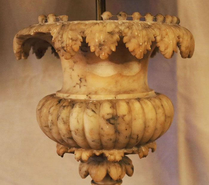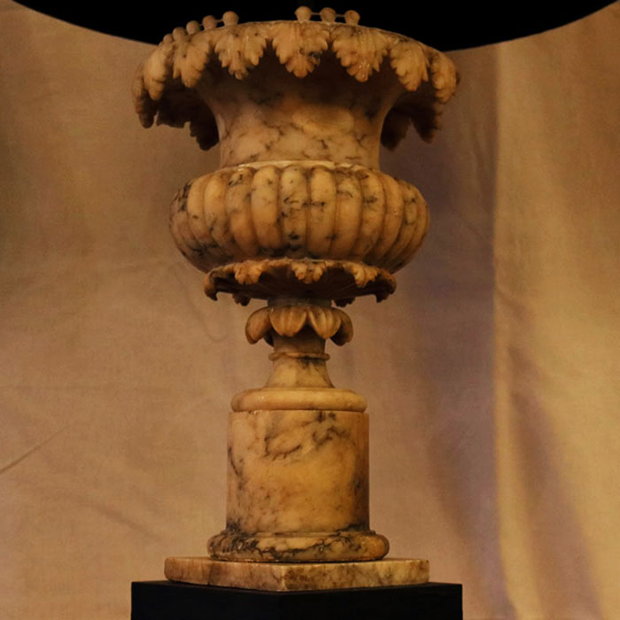 Questi vasi della prima metà dell’800 sono stati scolpiti in Italia, nella pietra dell’alabastro molto pregiata perché permette alla luce solare di attraversarli e mostrare la sua pregiata trasparenza con le sue striature.