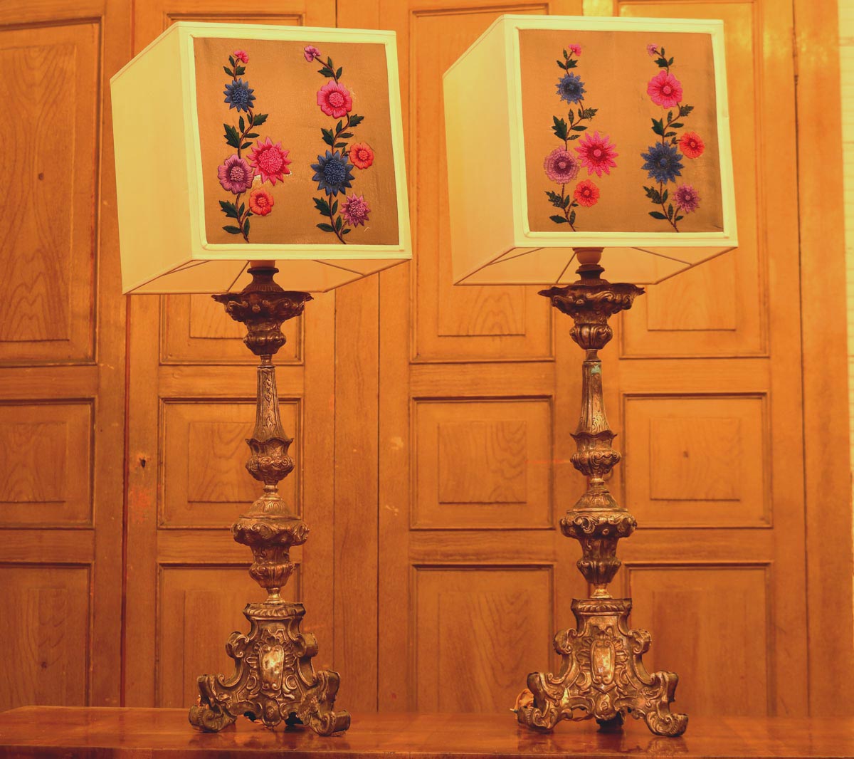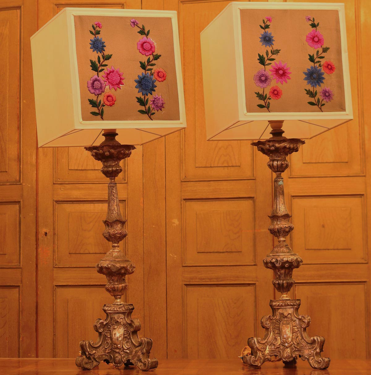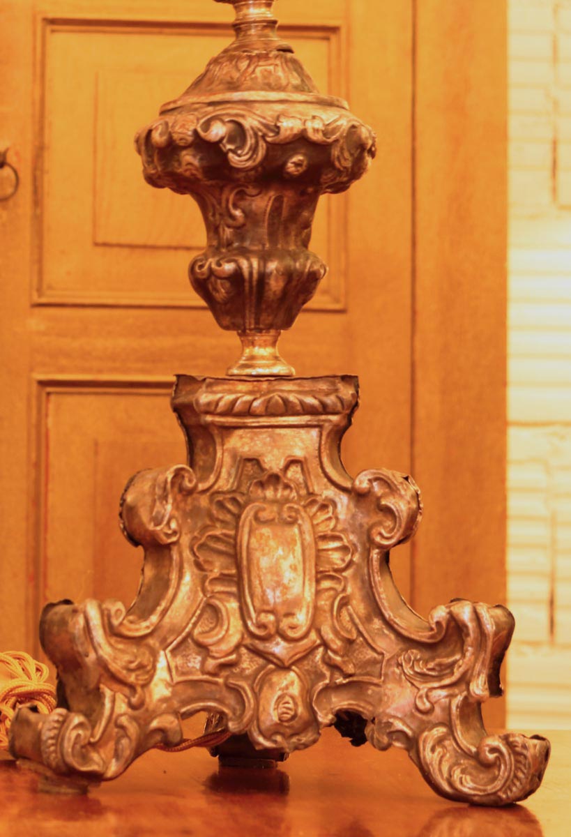 Coppia di lampade da tavolo con inserto due torciere in argento napoletano del XVIII secolo.