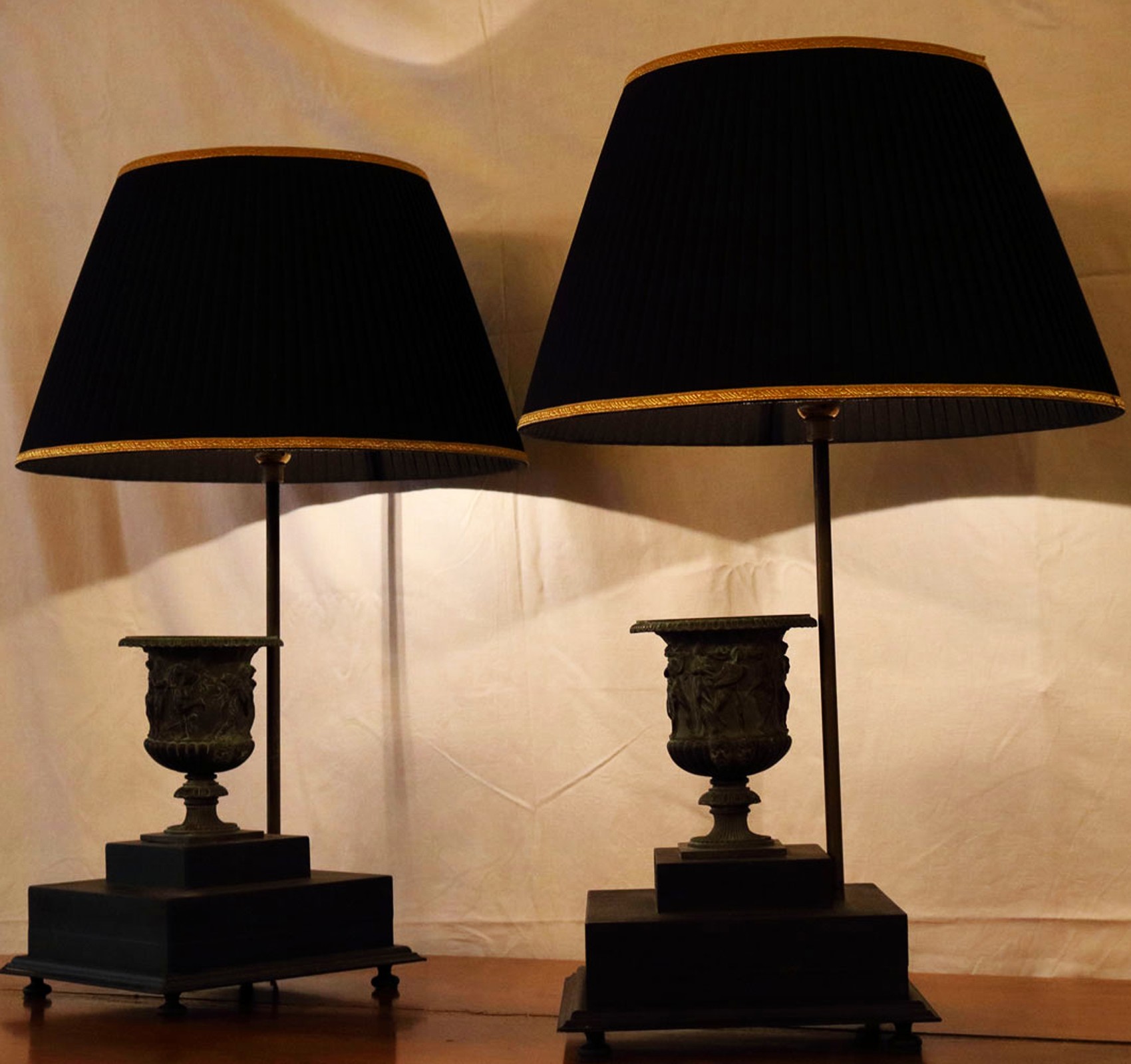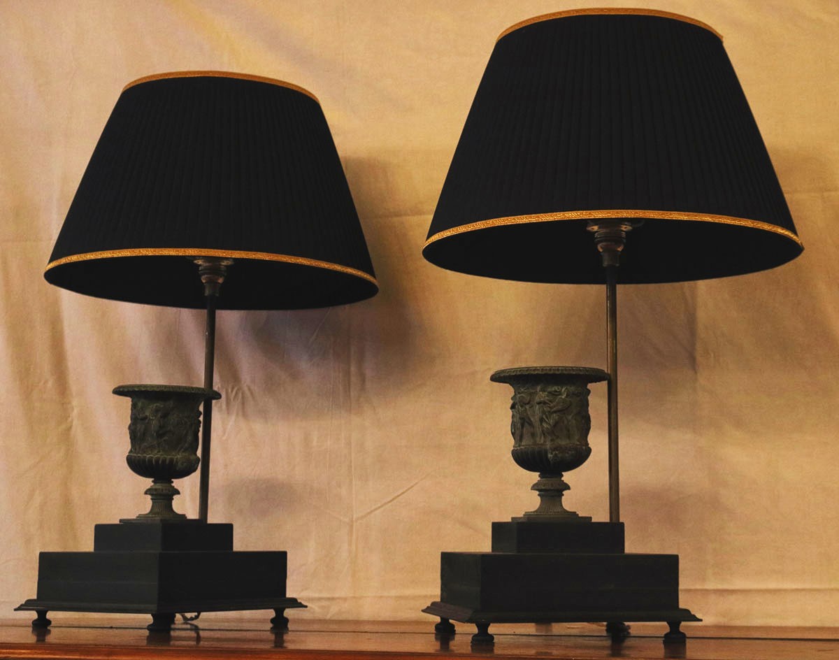 Coppia di lampade con inserto una riproduzione della prima metà del XVIII secolo del famoso vaso Borghese del 60 A.C.