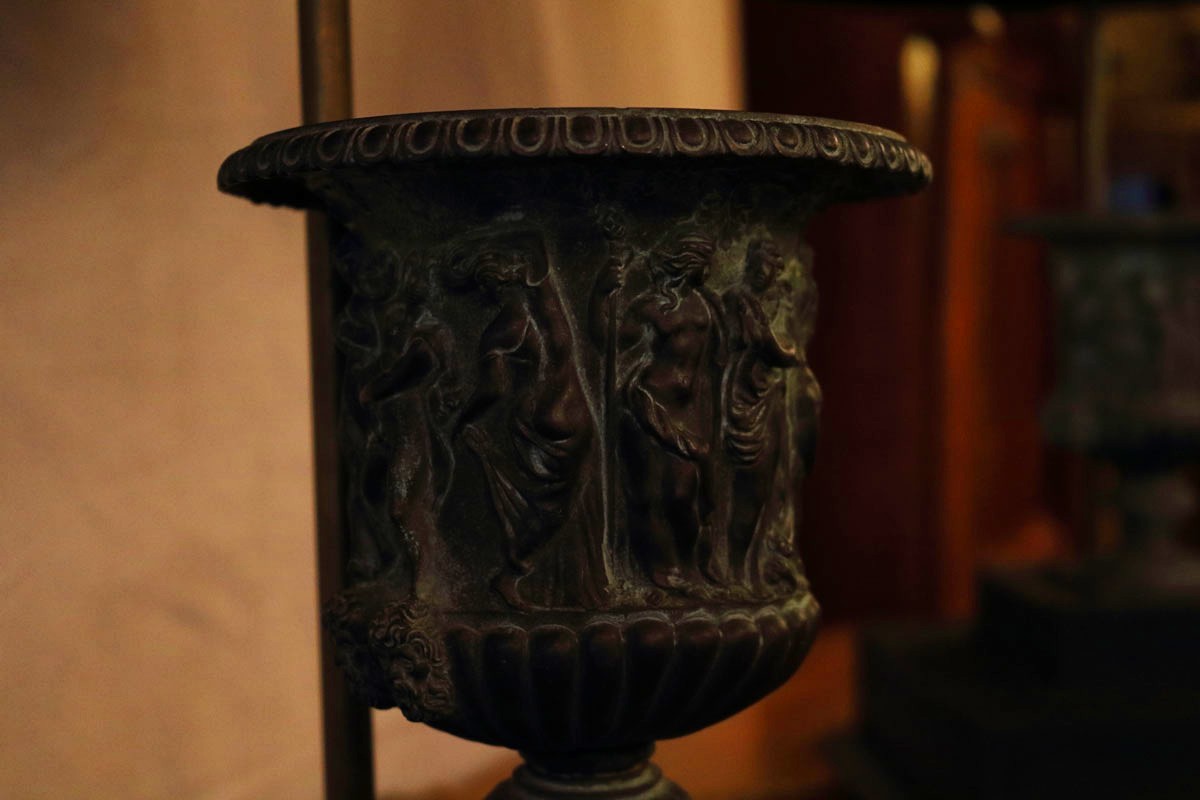 I due vasi in bronzo a fusione a cera persa sono stati fusi nella prima metà del XVIII secolo, rappresentano il noto vaso Borghese detto “a cratere” del 60 A.C., il quale fu ritrovato presso gli “horti Sallustiani” nel 1569 e acquistato dalla Famiglia Borghese nel 1645 per essere esposto a Villa Borghese, Napoleone lo portò a Parigi nei primi anni dell’800 e da allora è esposto nei Musei dell’Louvre.