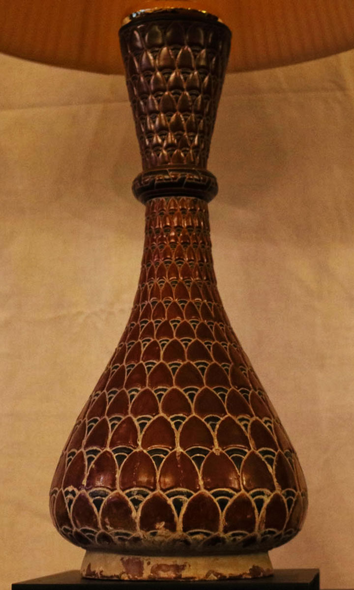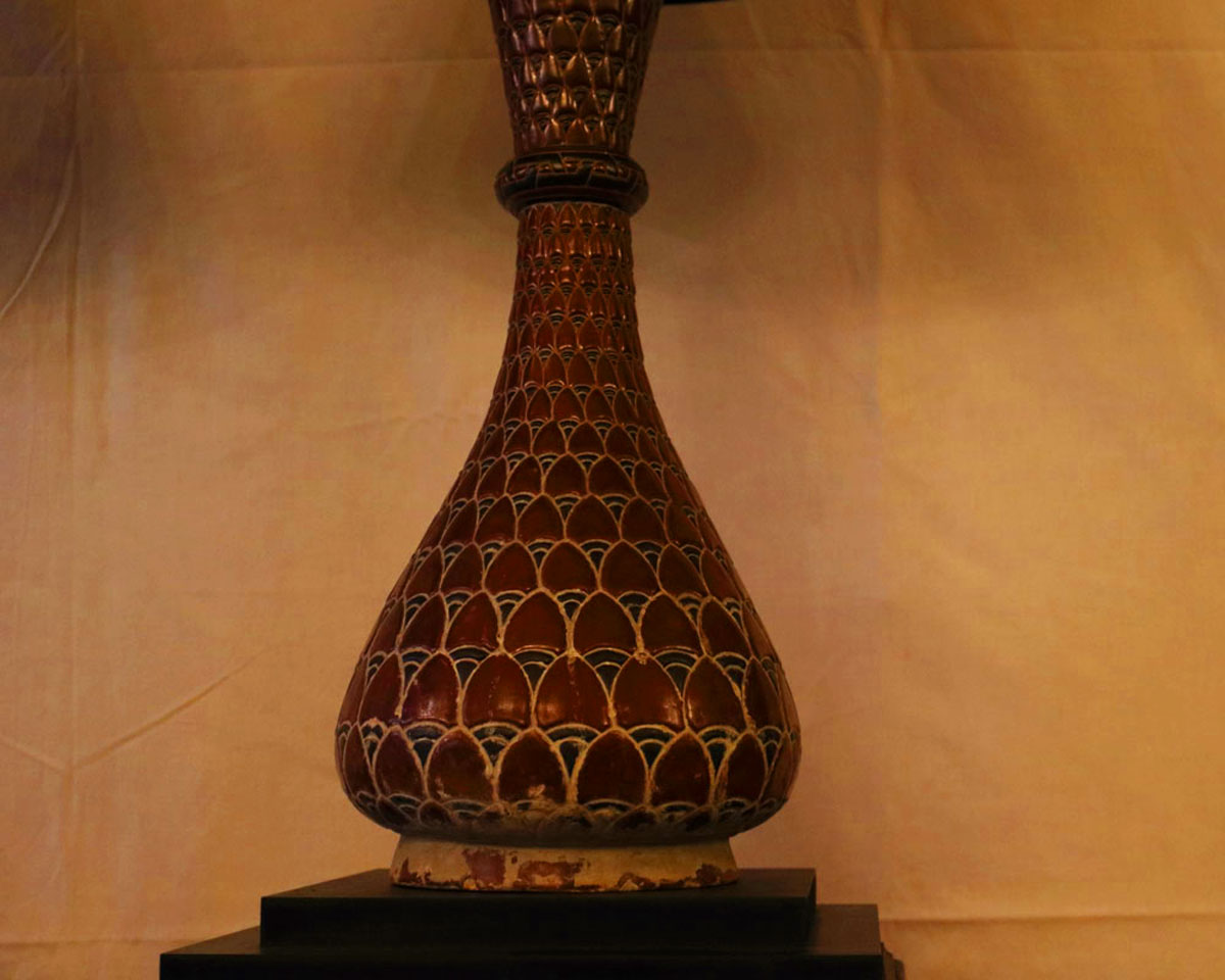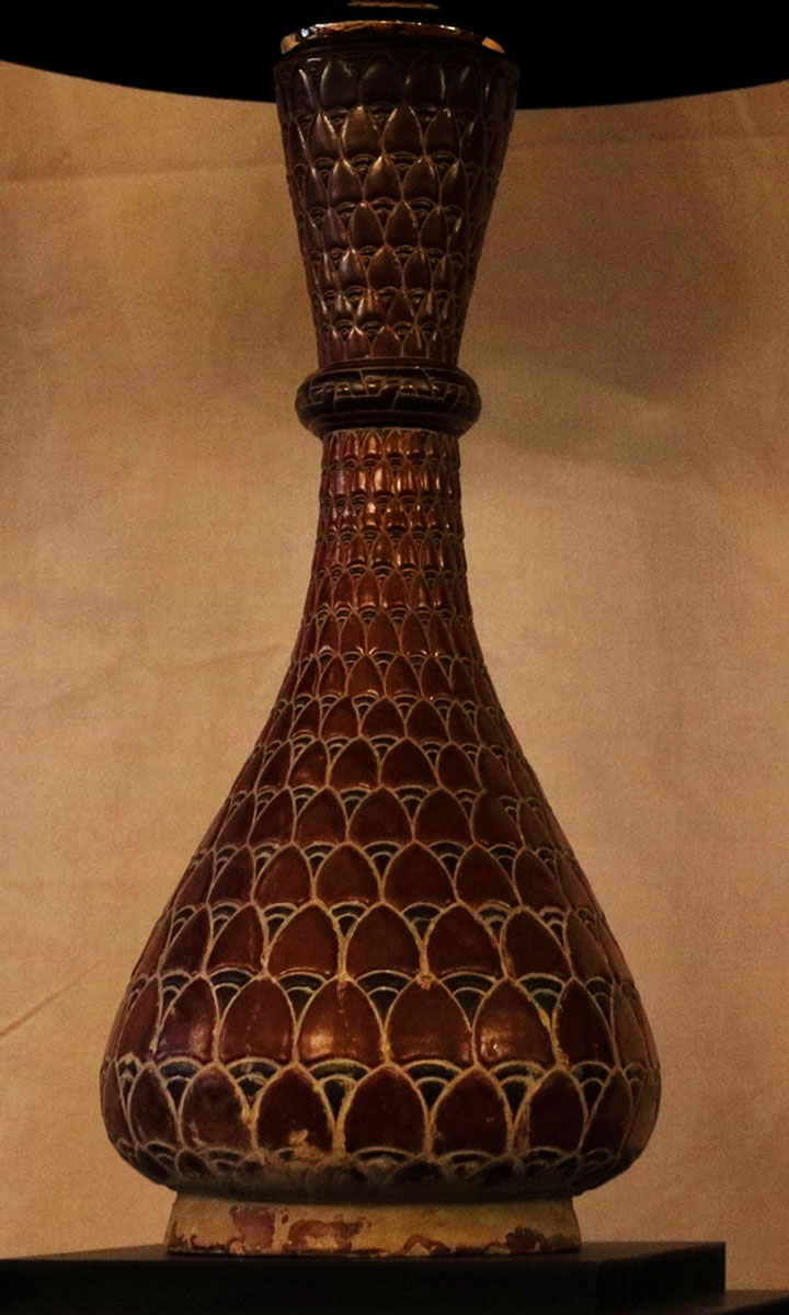 Questi vasi della seconda metà dell’800 rispecchiano un’influenza araba antica, dalla forma ad ampolla con il collo allungato e stretto da un anello. Il decoro a plettro invece nasce dalla cultura dell’antica Grecia, il plettro veniva utilizzato per suonare la lira. Raro e particolare questo colore mattone bordato di bianco e nero.