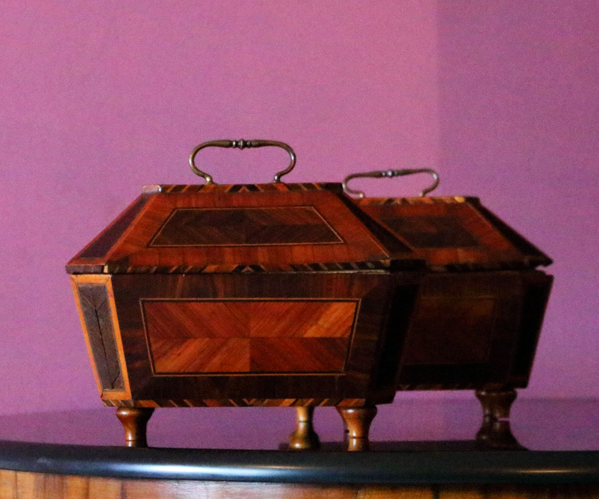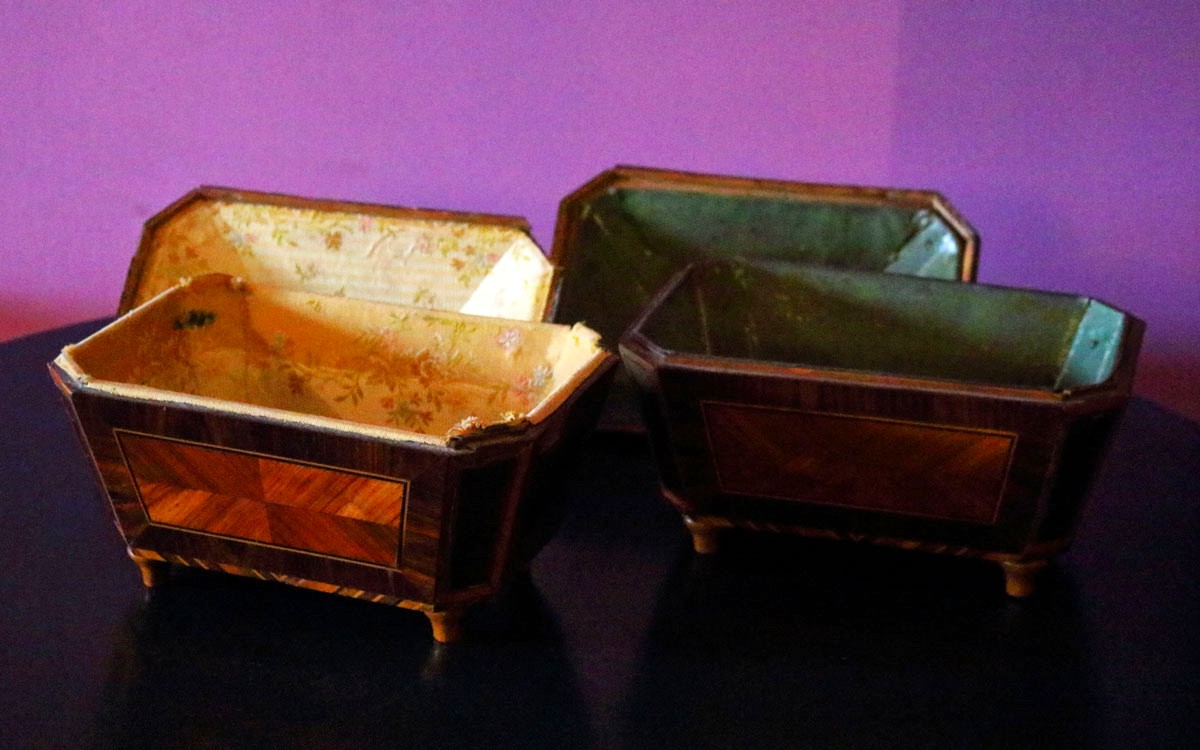 Si tratta di una coppia di porta gioielli da camera intarsiate con legni di frutto, di bosso e d’ebano. Le loro maniglie sono in bronzo argentato.