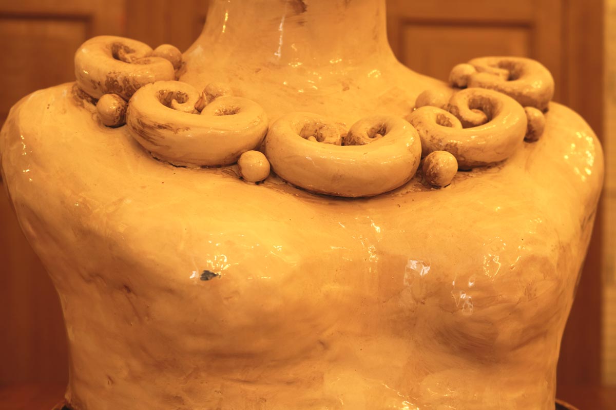 Tipico mezzo busto di ceramica di Caltagirone del 1970, raffigurante una donna africana. Quest’opera è stata realizzata in biacca bianca, ovvero un particolare pigmento pittorico inorganico costituito da carbonato basico di piombo.