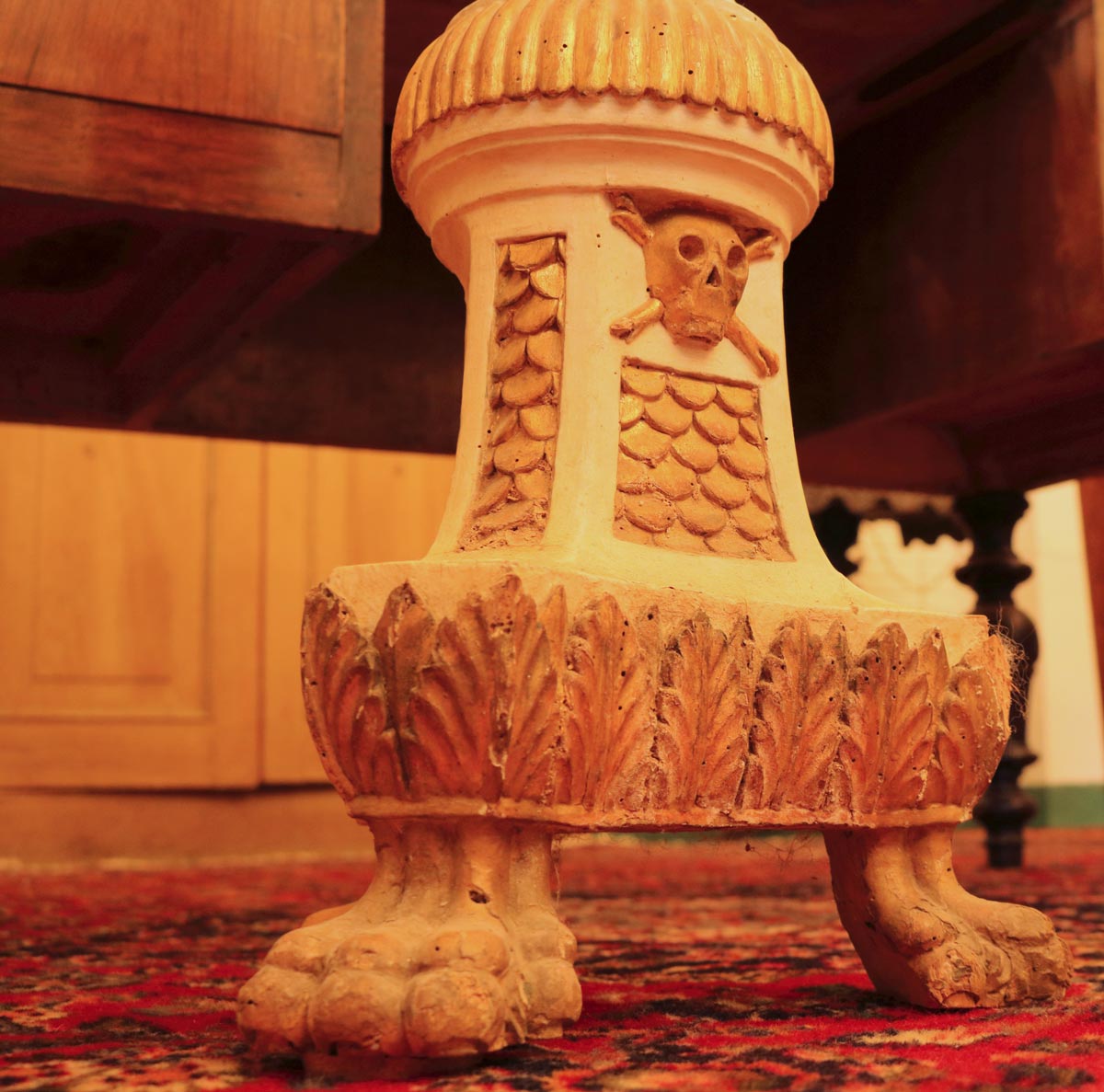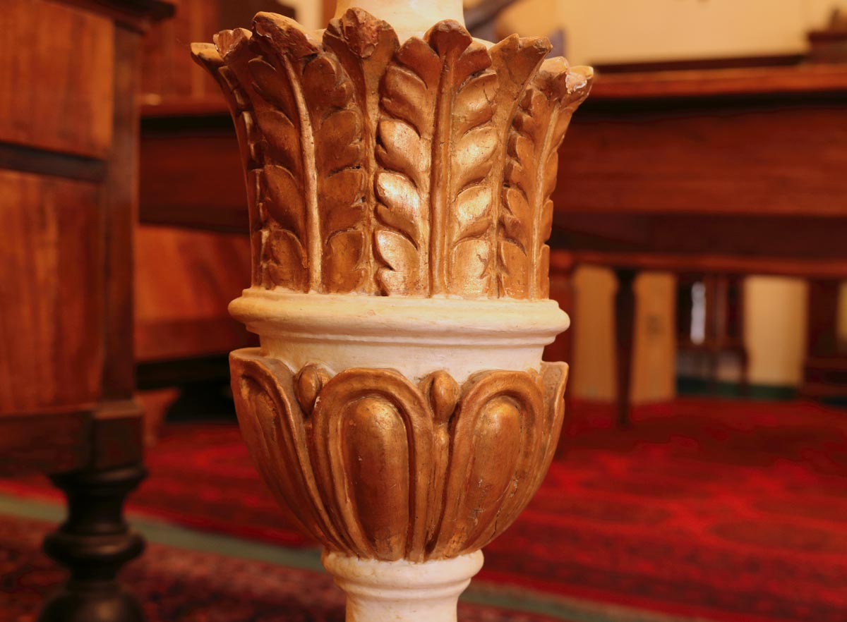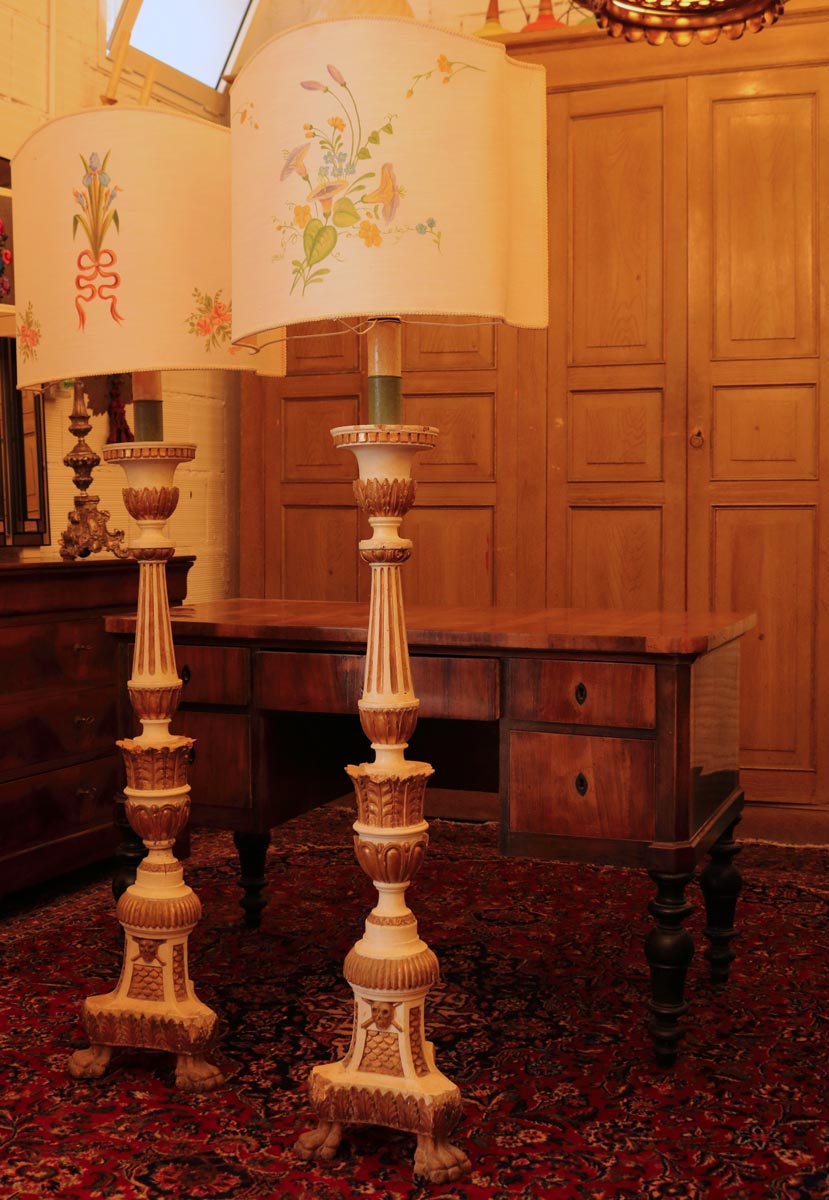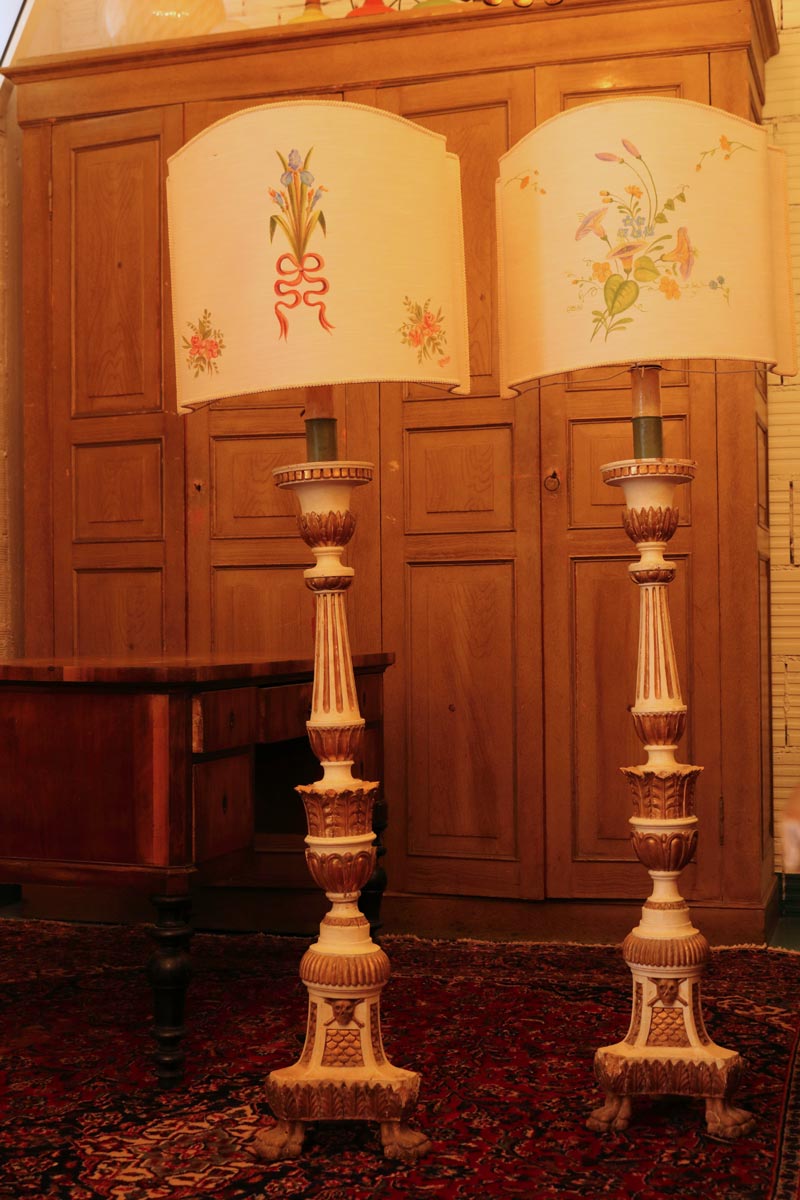 Questa coppia di piantane da terra è stata realizzata in legno intagliato, laccato e decorato in foglia d’oro. I paralumi sono in tessuto di cotone con dipinti dei motivi floreali e grottesche, ovvero figure inesistenti a fantasia di chi le crea.