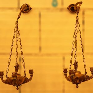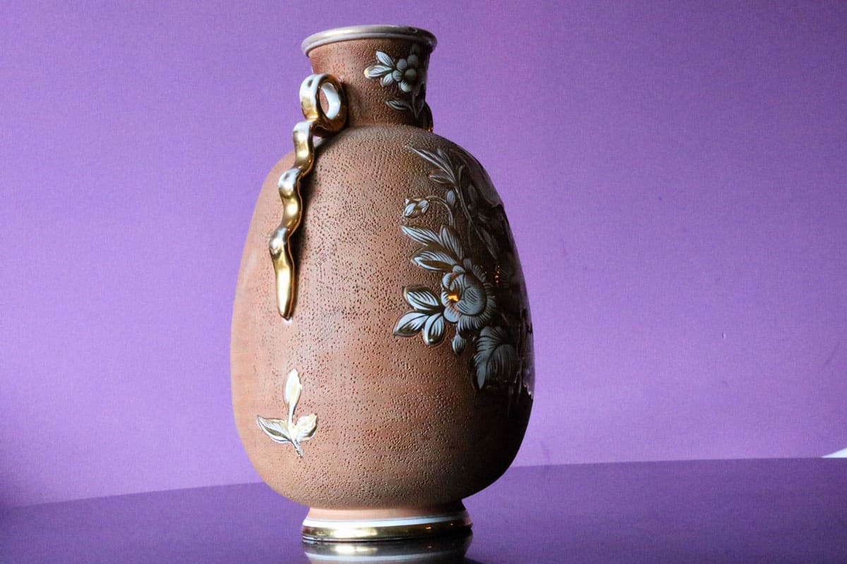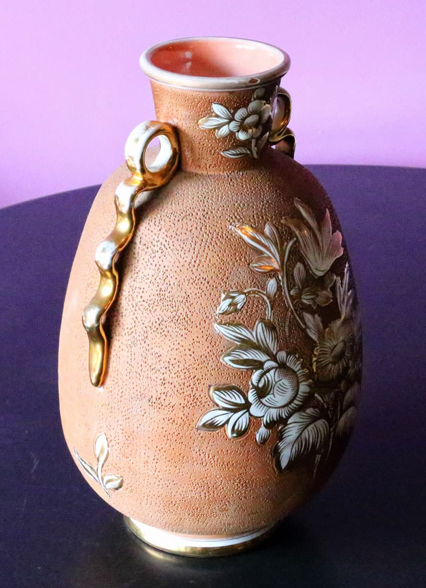 Questo vaso dall’aspetto raffinato è stato realizzato in terraglia con lavorazione ad invetriatura a foglia d’oro. Presenta un bellissimo decoro floreale ad incisione mentre le due anse laterali sono ad onda.